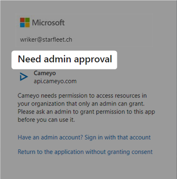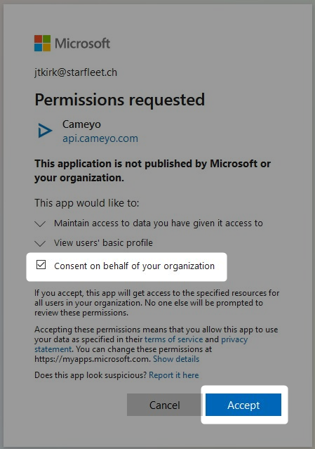 Log in with a user that has administrative privileges prior to the standard users and tick the option [Consent on behalf of your customer] and then [Accept].
