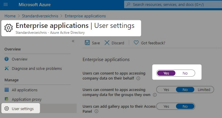 - Change the option [Users can consent to apps accessing company data on their behalf] to YES
