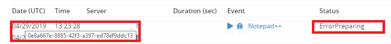 Sessions under this failure category appear with an "ErrorPreparing" status. If you hover the mouse over the session's date/time, it will show the session's unique token ID, as shown below: