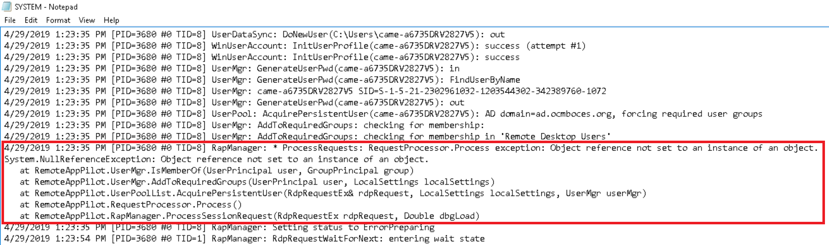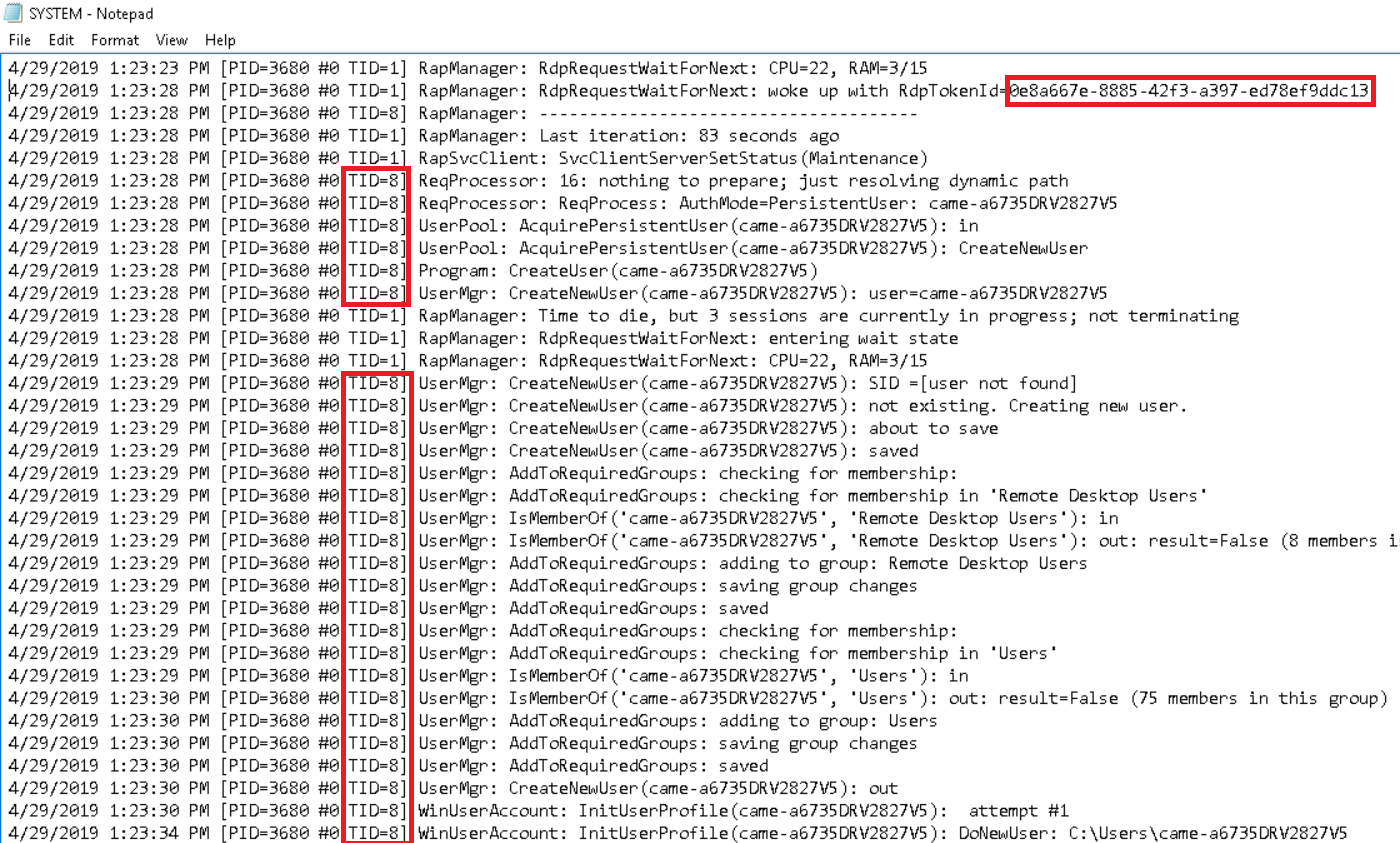 For this type of errors, the first log to look at is C:\RemoteAppPilot\Logs\System.log on the relevant server. Open it and look for this token ID. Then, follow the thread ("TID") (in this case TID=8):